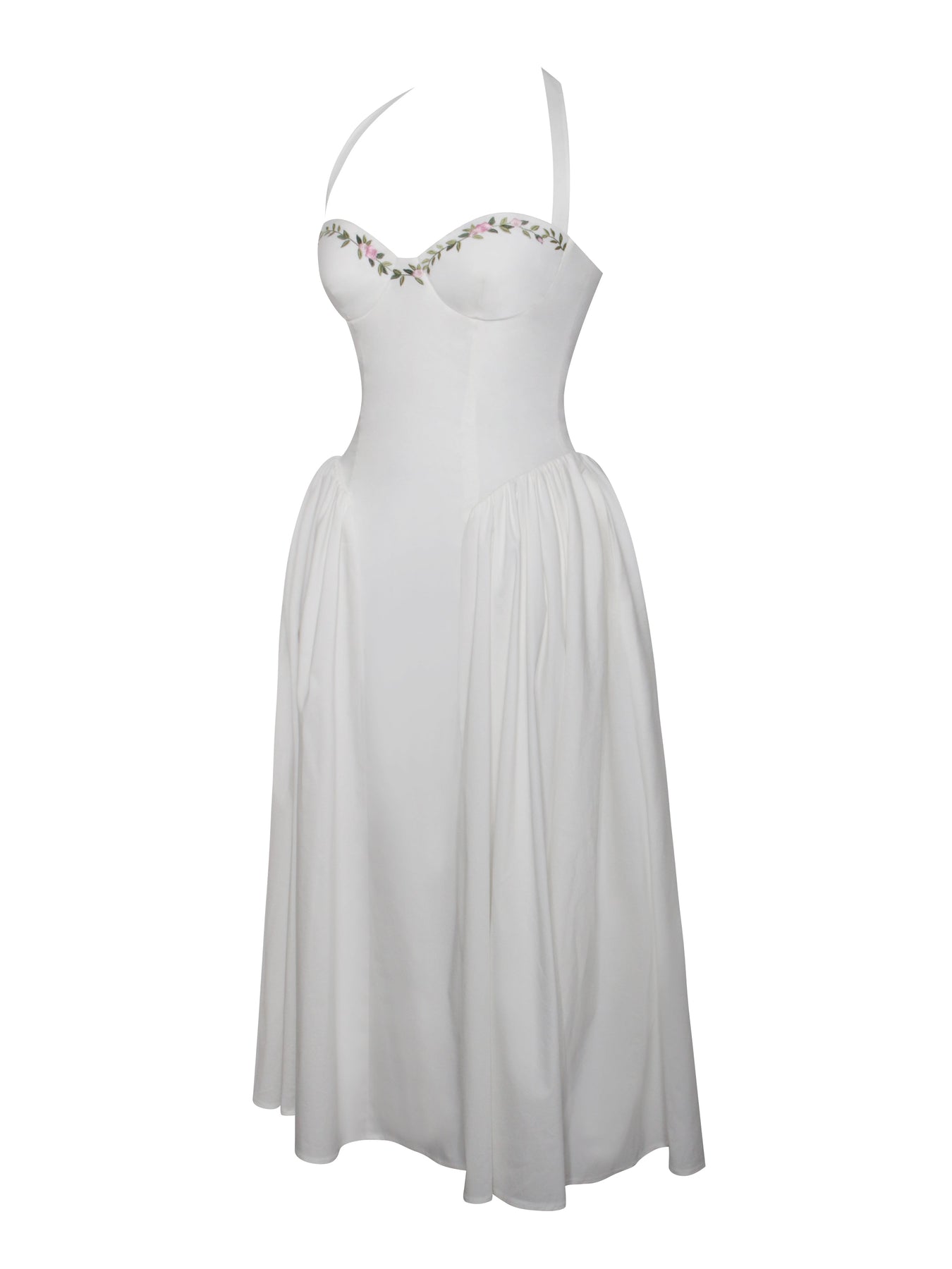Discover the elegance of our eco-luxe Gianna maxi dress, designed to make a lasting impression with its refined details. Featuring padded cups and built-in boning, this dress offers a flattering and supportive fit. The halter strap exudes sophistication, complemented by delicate embroidered floral details. A pleated skirt flows gracefully to the floor, enhancing its elegant silhouette. An invisible zipper ensures a seamless finish. Ideal for any formal occasion, this dress is also available in a mini version.