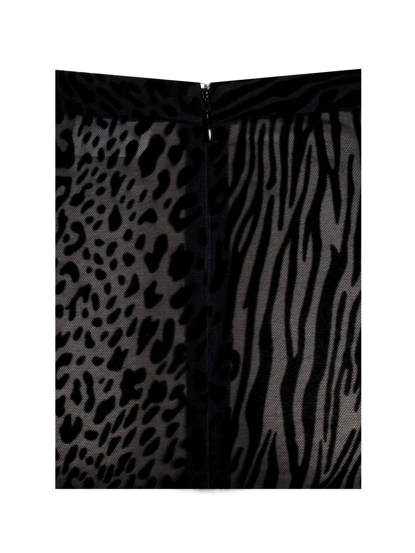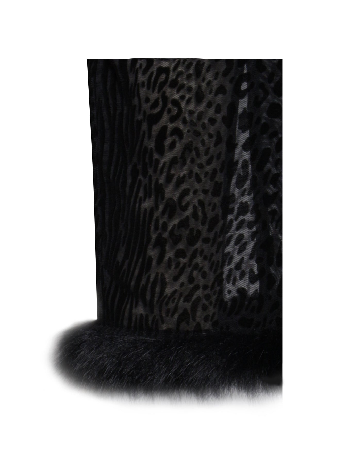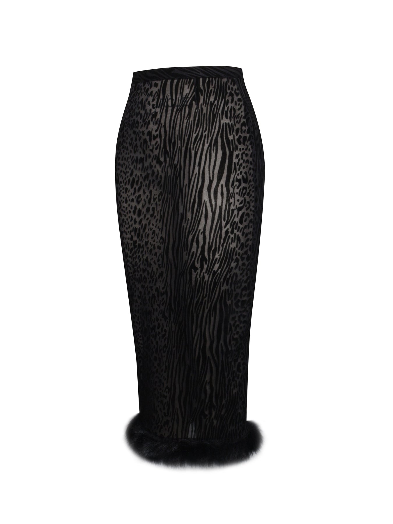 Complete your look with the Halia Skirt, a show-stopping piece made from animal print velvet burnout mesh fabric. This stretchy skirt is designed to flatter, featuring a dramatic fur trim hem for added elegance. Finished with an invisible zipper, the Halia Skirt is the perfect partner to the Hali Top, creating a bold and cohesive ensemble that’s perfect for turning heads.