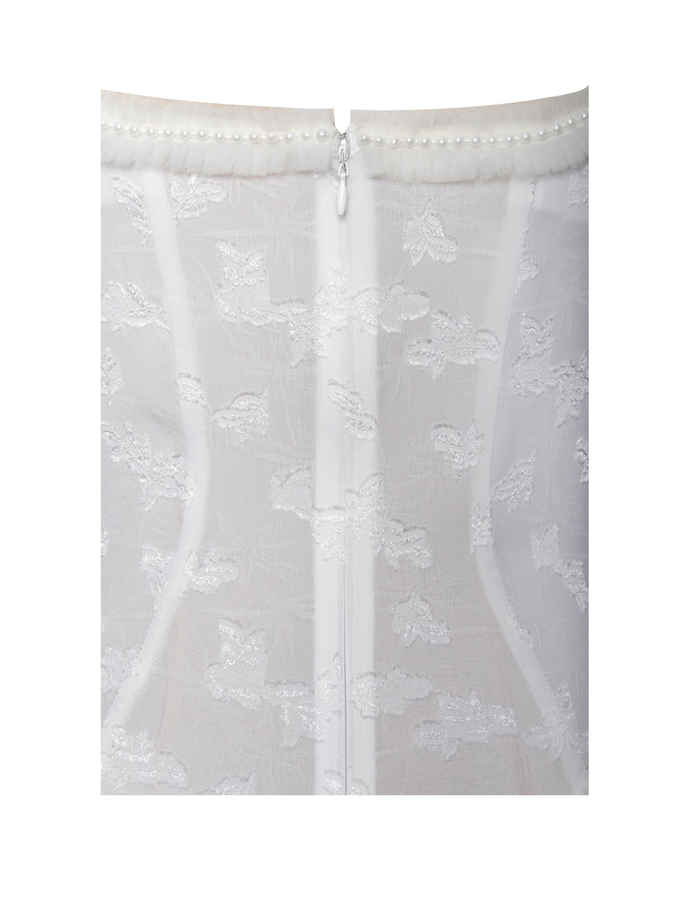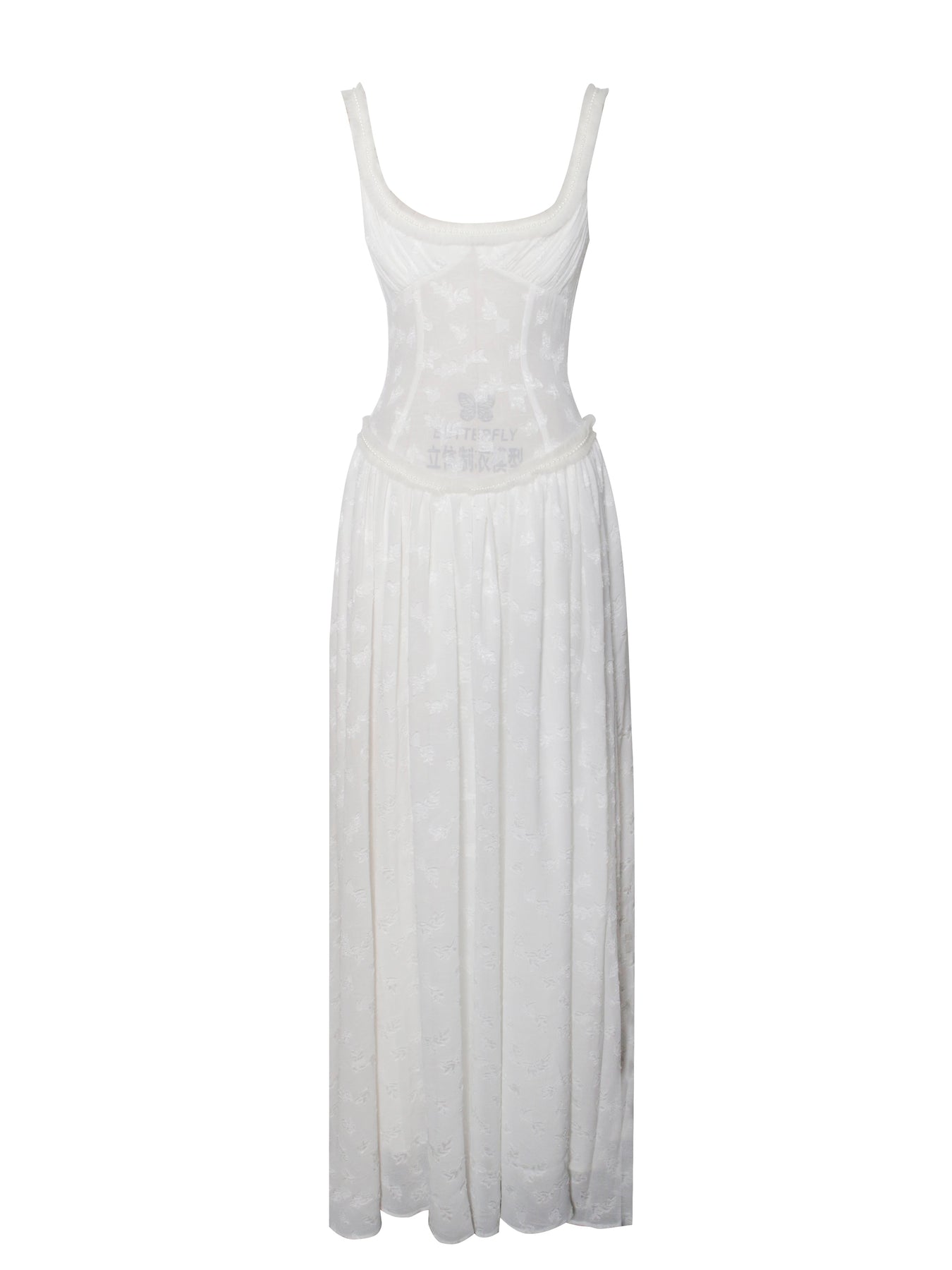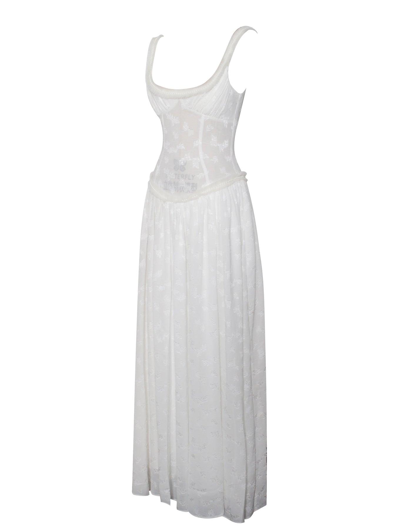 Introducing the Ulissa dress, where elegance meets modern sophistication. This jacquard textured maxi dress is fully lined for ultimate comfort and features a striking square neckline adorned with pearl decorations. The drop waist gracefully transitions into a high-slit skirt, adding a dramatic flair to the silhouette. Delicate pleated mesh trim enhances the design's femininity, while an invisible zipper at the center back ensures a flawless finish. Perfect for any formal occasion, this dress effortlessly combines timeless charm with contemporary style, making it a standout piece in any wardrobe. It is also available in Light Green.