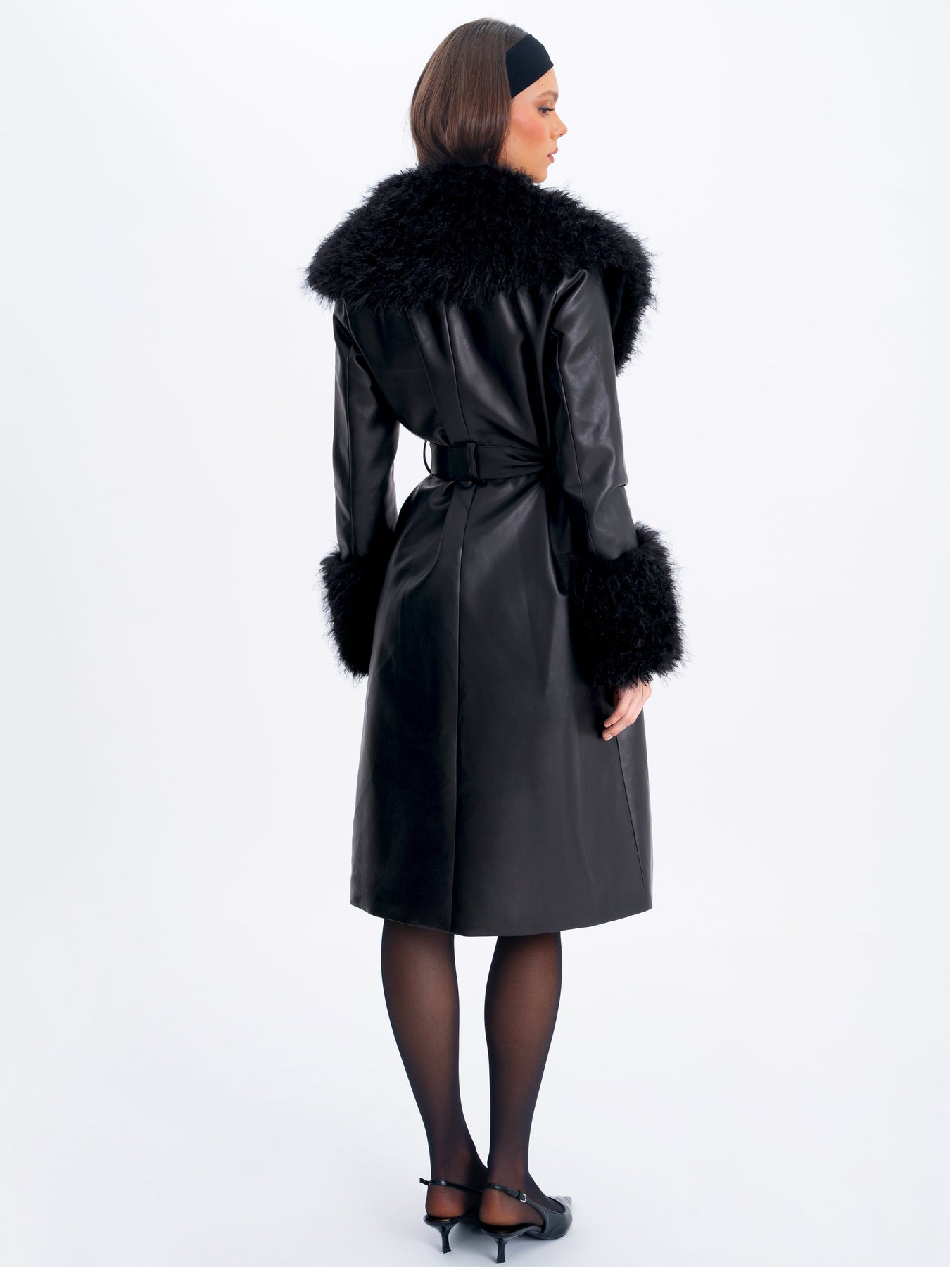 Meet your cold-weather power move—the Zariah Coat, a longline statement piece in sleek vegan leather with just the right amount of drama. Trimmed with plush faux fur at the neckline and cuffs, it delivers main character energy with every step. The overlapping front design pairs with a matching belt and secure belt loops to keep the silhouette cinched and polished. A luxe sateen-lined interior keeps things extra cozy, while exterior pockets add both function and flair. This is your go-to for winter days when you want to look fierce, feel warm, and turn sidewalks into runways.
