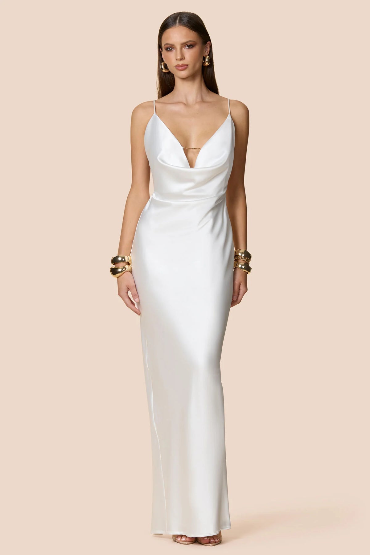Timeless bias-cut satin gown with a draped neckline and gorgeous low back. The fine antique chan takes this dress to the next level, holding the bust together and draping along the back. Adjustable straps, split at back hem, fully lined.