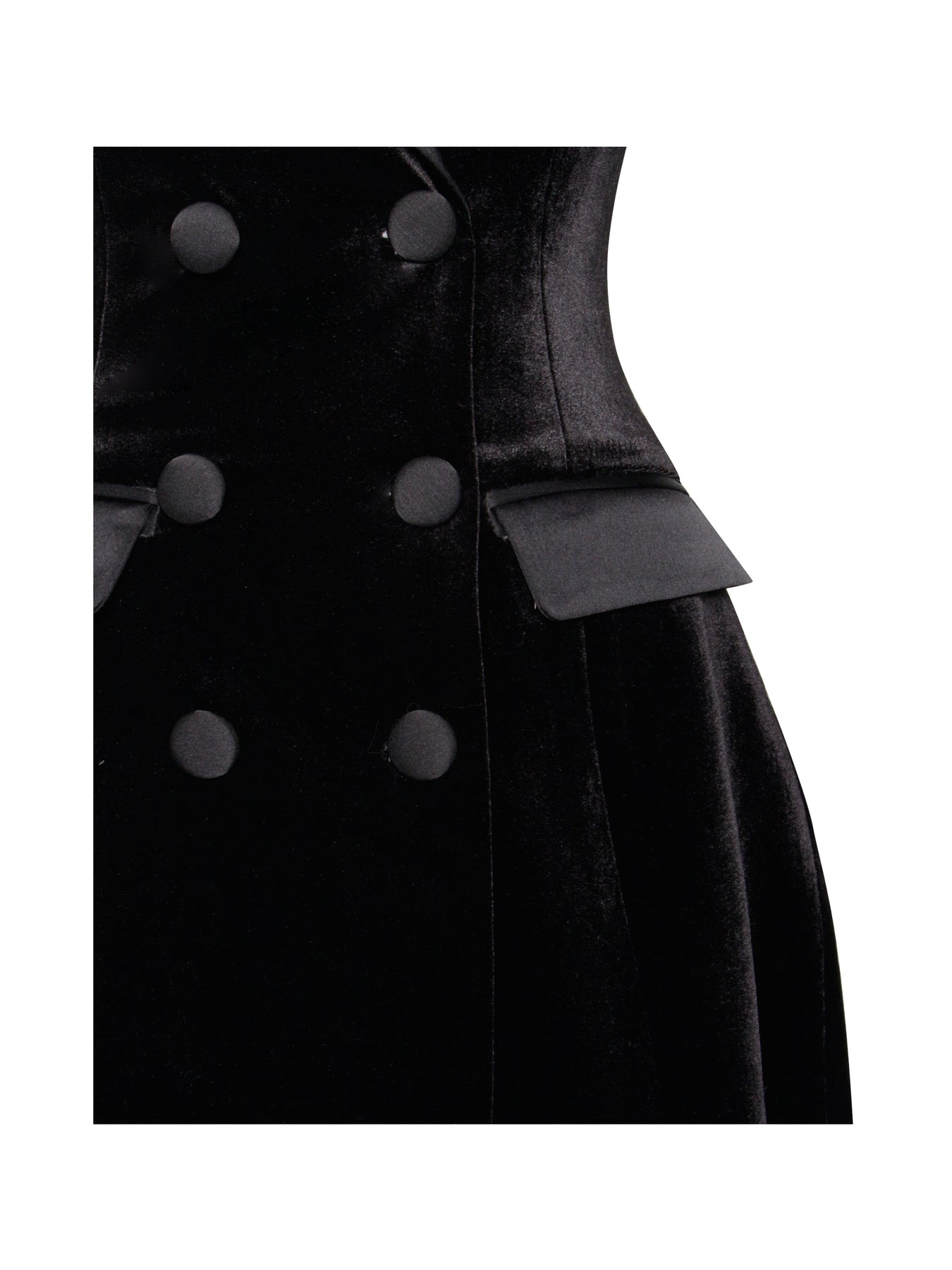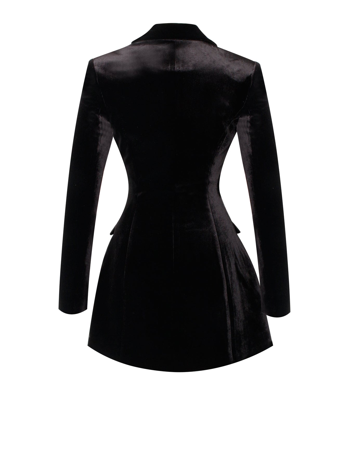 Step into sophistication with our black velvet blazer dress, complete with luxurious lining for a polished look and comfortable feel. This refined piece is adorned with satin collar and pocket cover and fabric-covered buttons, adding a touch of elegance to the ensemble. Designed with faux pockets strategically placed to maintain the elegance while accentuating your waist curve, this dress offers both style and functionality. Perfect for transitioning seamlessly from the office to after-work drinks, this versatile black blazer dress is a timeless addition to any wardrobe. And it is also available in black crepe for Spring.