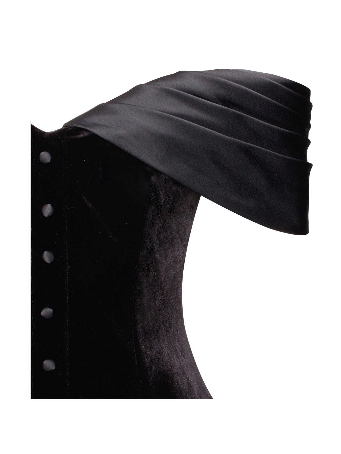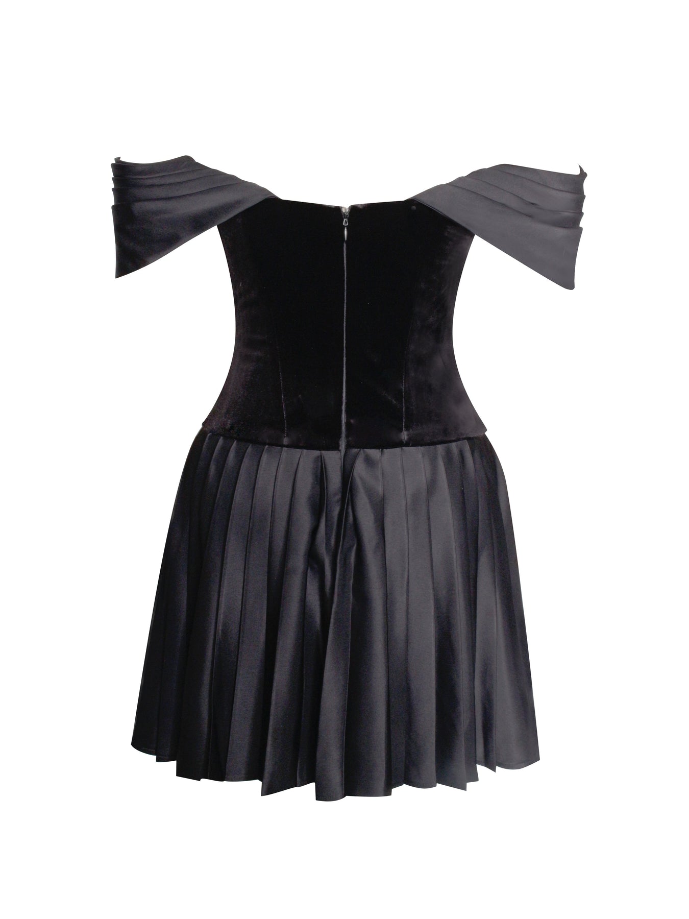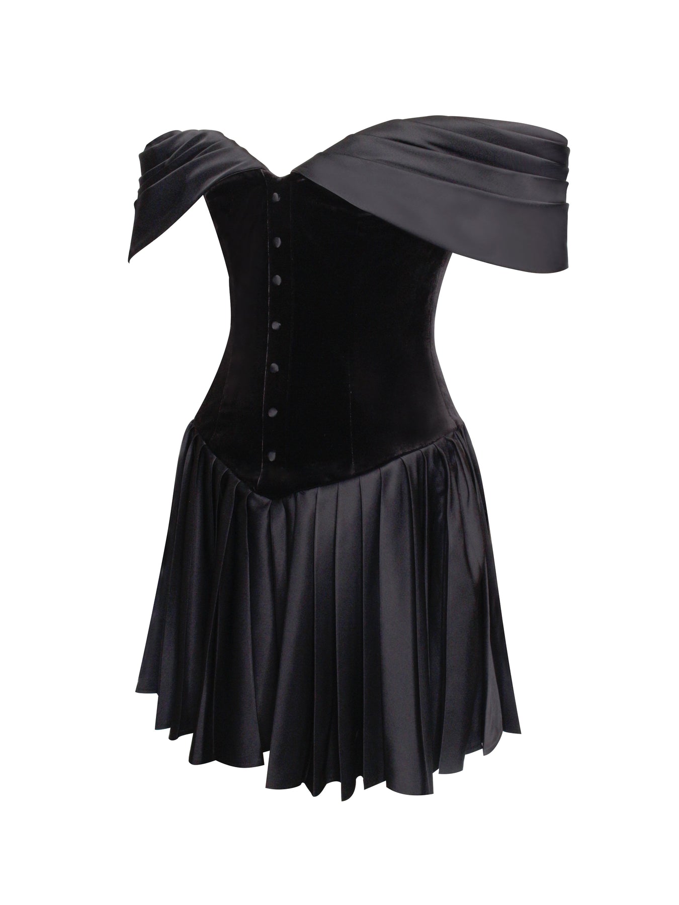 Introducing the Echo Dress, a stunning combination of luxurious textures and elegant design. This dress features rouched satin off-shoulder sleeves that drape gracefully for a romantic look, while satin-covered buttons add a touch of refinement. The pleated satin skirt flows from a drop waist design, creating a flattering silhouette, and the velvet body with built-in bones ensures a structured, curve-enhancing fit. Fully lined for comfort and equipped with an invisible zipper, the Echo Dress is perfect for those seeking timeless elegance with a contemporary twist.