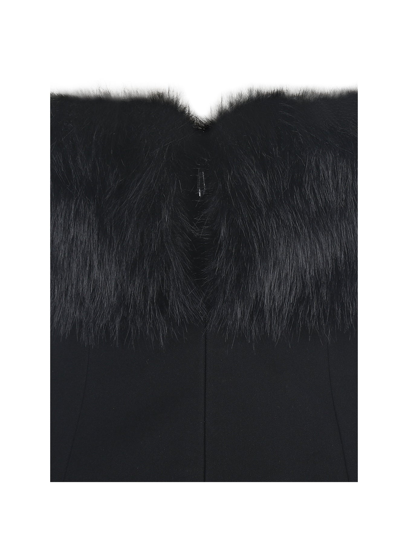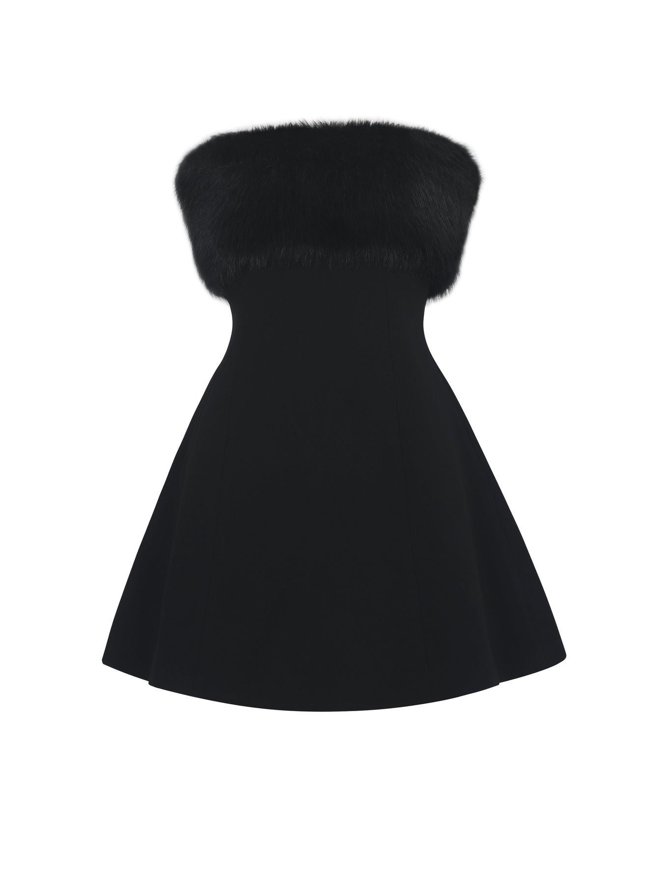 The Evelyn Dress is a refined take on fall occasion dressing. Designed in a classic mini length and lined for a smooth, comfortable fit, this strapless black silhouette balances elegance with modern appeal. The fur-trimmed bustline adds a statement finish, while the A-line skirt and hidden pockets keep things practical. An invisible back zipper ensures a sleek, streamlined fit. Complete the look with the coordinating Eve opera-length gloves, sold separately, for an elevated styling option. Ideal for cocktail events, evening gatherings, and seasonal celebrations.