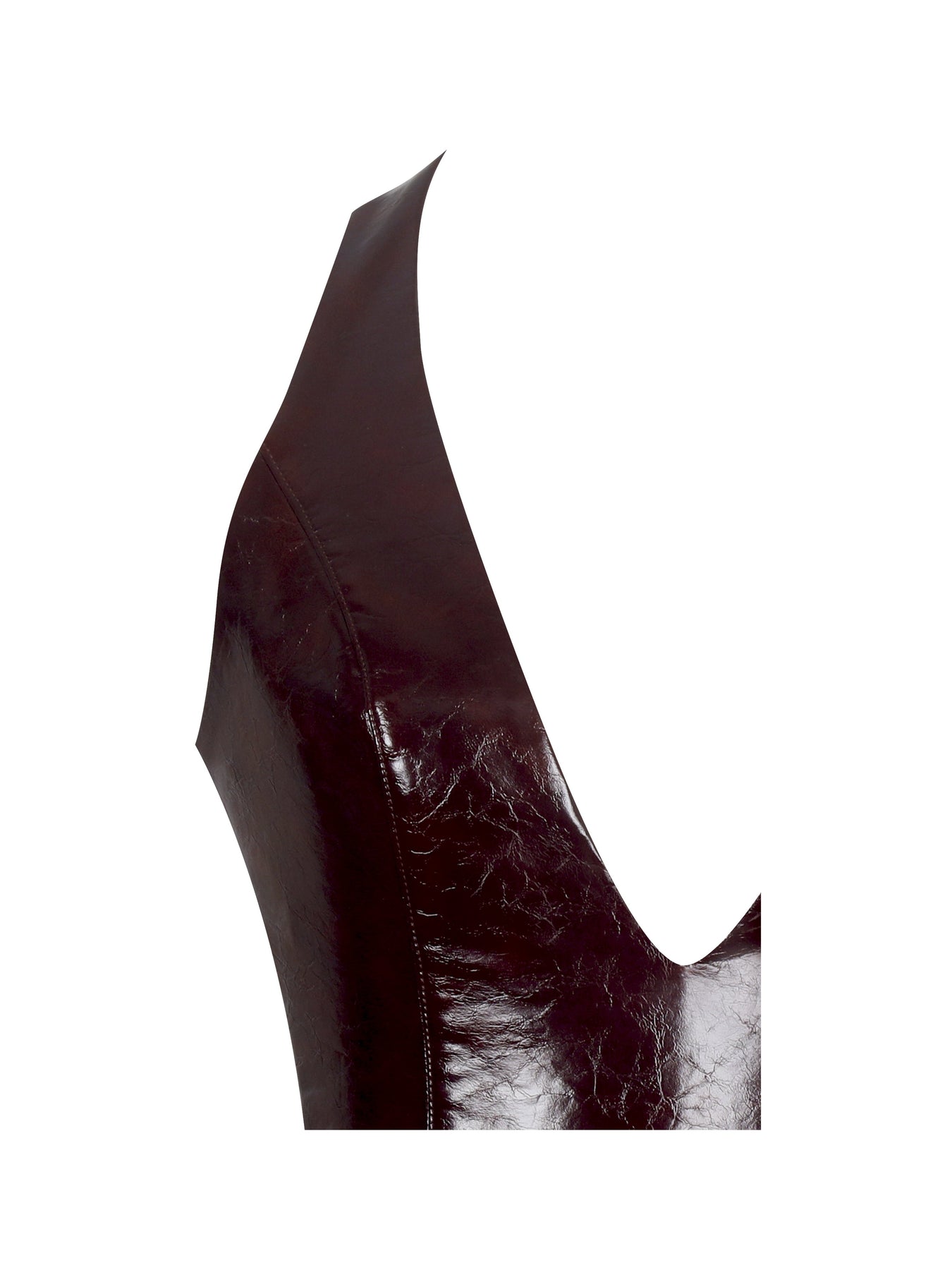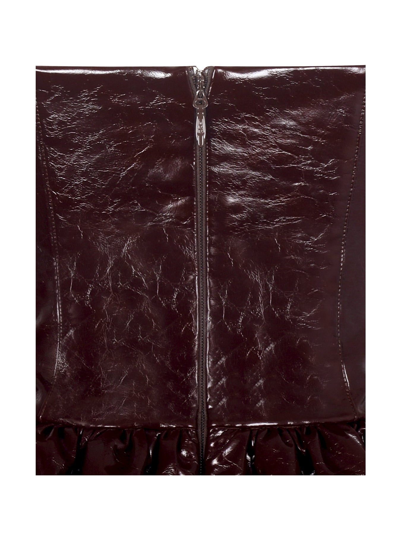 Elevate your holiday wardrobe with the Jaslene Dress in a rich mahogany hue. Cut from sleek vegan leather, this plunge V-neck silhouette brings just the right mix of polish and drama. Top-stitched princess seams contour the body, while a ruched peplum waistline adds a wink of playful structure. A halter neckline fastens with shank buttons for a tailored touch, and a back vent keeps every step effortless. Fully lined in satin and finished with an invisible back zipper, it’s as smooth as it looks. The Jaslene Dress is made for clinking glasses, late-night toasts, and every party where elegance comes with a little bite.