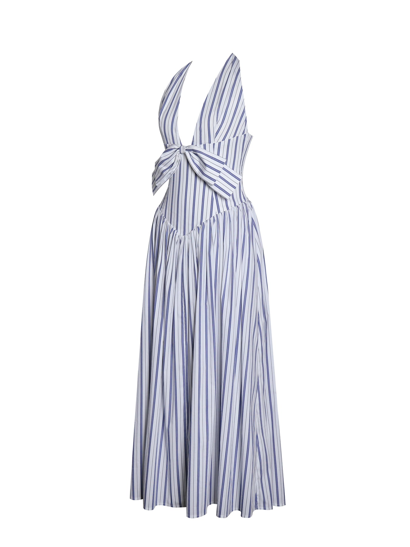 Breeze through your holiday in effortless elegance with the Mackenna Dress. Designed in a classic navy beach-style stripe, this maxi dress channels relaxed vacation vibes with a polished twist. The halter neckline adds a touch of sophistication, while the smocked back and invisible zipper ensure a comfortable and flattering fit. A drop waist flows into a graceful silhouette, complete with invisible pockets for added functionality. Whether you're strolling along the coast or dining under the stars, the Mackenna Dress is your go-to piece for vacation-ready style.