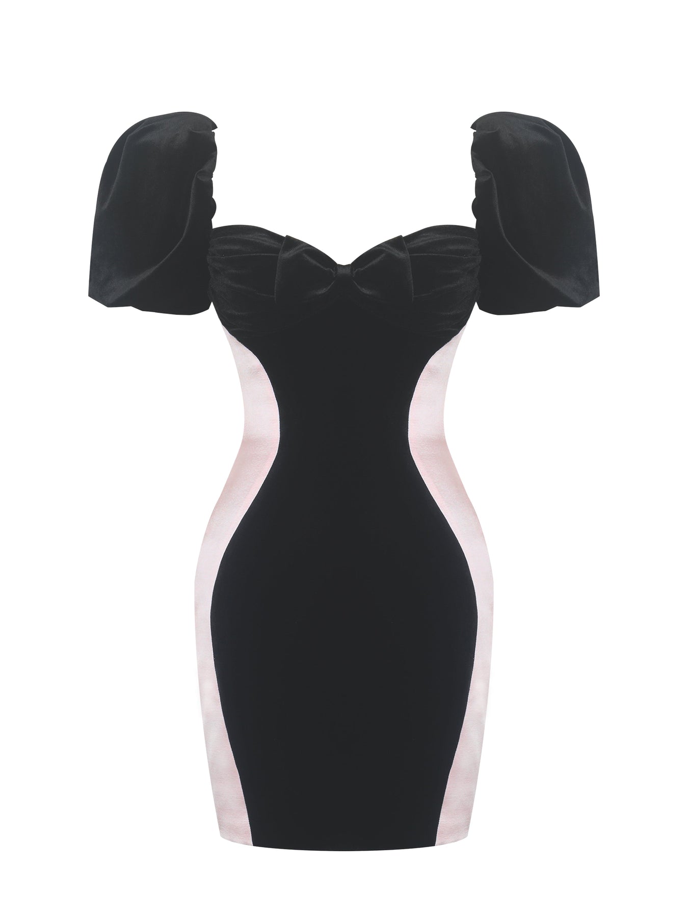 The Nova Dress is your flirty-meets-feminine answer to the party season. With puffy short sleeves and a square sweetheart neckline, it’s designed to frame the décolletage beautifully, while ruching across the bust and a bow at the center add a playful finish. Light pink satin side panels curve along the body for a sculpted effect, contrasting perfectly with the black velvet base. Built-in cups offer support, a back tie strap and invisible zipper keep the fit secure, and the full satin lining makes it as comfortable as it is striking. The dress to wear when you want to turn heads at holiday soirées and late-night plans alike.