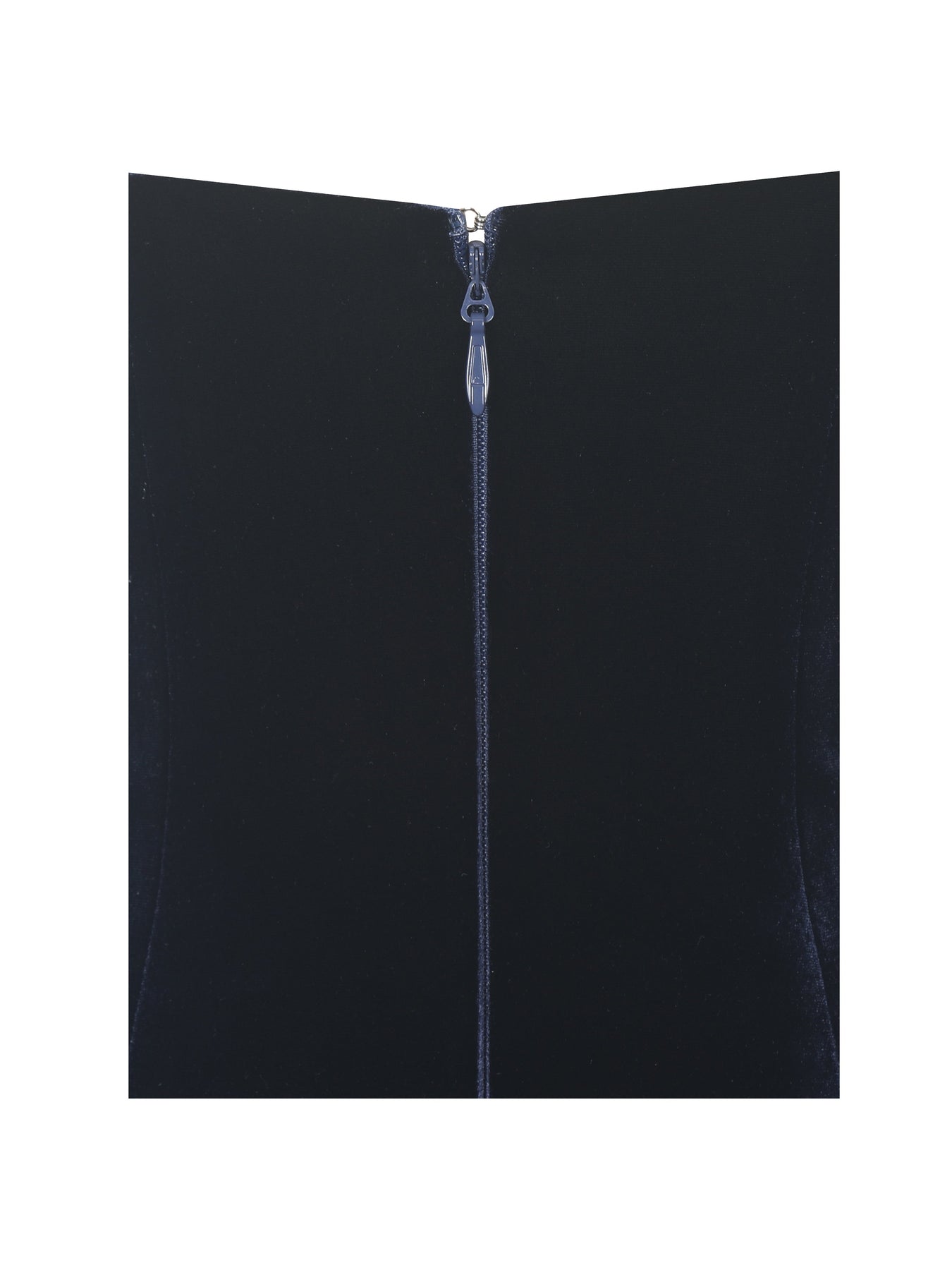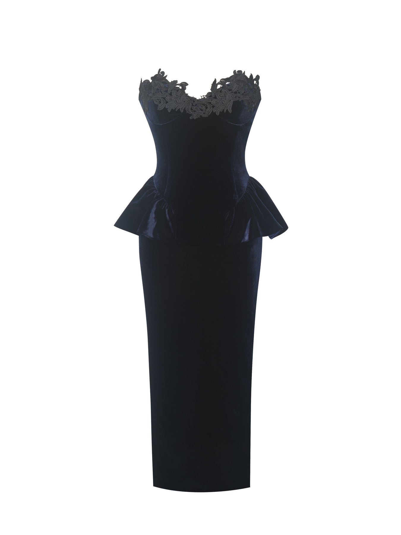 Say hello to velvet drama with the Pascha Dress—a strapless stunner that brings old-Hollywood glamour with a wink. Crafted in rich, sculpting black velvet, this peplum midi features a sweetheart neckline, built-in cups, and a hidden corset that cinches just right. Hand-sewn lace appliqué dances along the bust for a touch of romance, while princess seams and a low-waisted cut serve serious hourglass energy. The full-length skirt sways with ease, thanks to a back vent that keeps things effortlessly graceful. Lined in satin and finished with an invisible zipper, it’s your go-to for black-tie nights, gala glows, and unforgettable entrances.