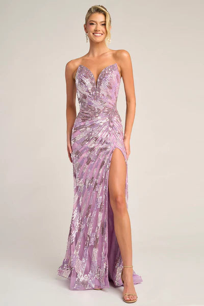 PS26413C exudes high-octane glamour, shimmering from every angle with its striking mosaic beadwork in radiant gold tones. The strapless sweetheart neckline sculpts the d?colletage, while the figure-hugging silhouette contours the waist and hips before flowing into a dramatic sweep train. A daring thigh-high slit adds movement and allure, creating the perfect balance of sophistication and seduction. Finished with a dazzling, light-reflective pattern that elongates the body, this gown is designed to command attention at formal evenings, red-carpet events, and unforgettable celebrations.