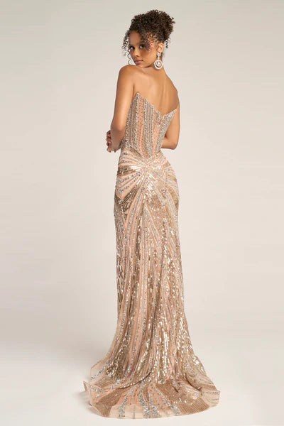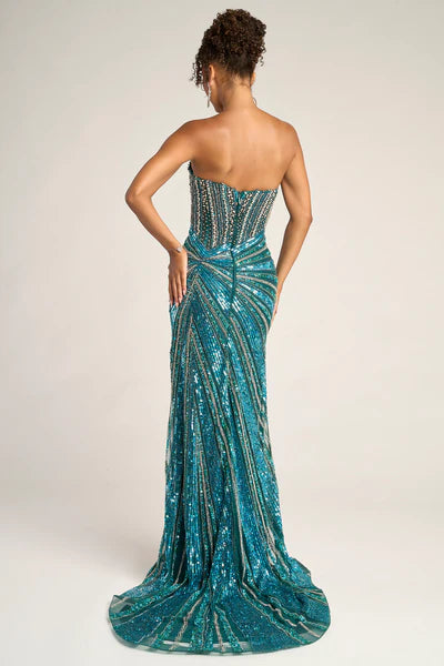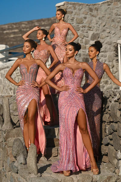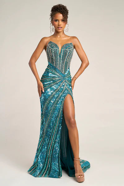 PS26431C radiates high-impact glamour with its sleek, sculpted silhouette and dazzling sequin embellishments. The strapless neckline features a subtle plunge that enhances the body, while the intricate bead pattern draws the eye toward the waist for a figure-defining effect. A thigh-high slit adds a touch of allure, balancing the gown?? bold shimmer with sophisticated elegance. Perfect for formal occasions where confidence and sophistication take center stage.
