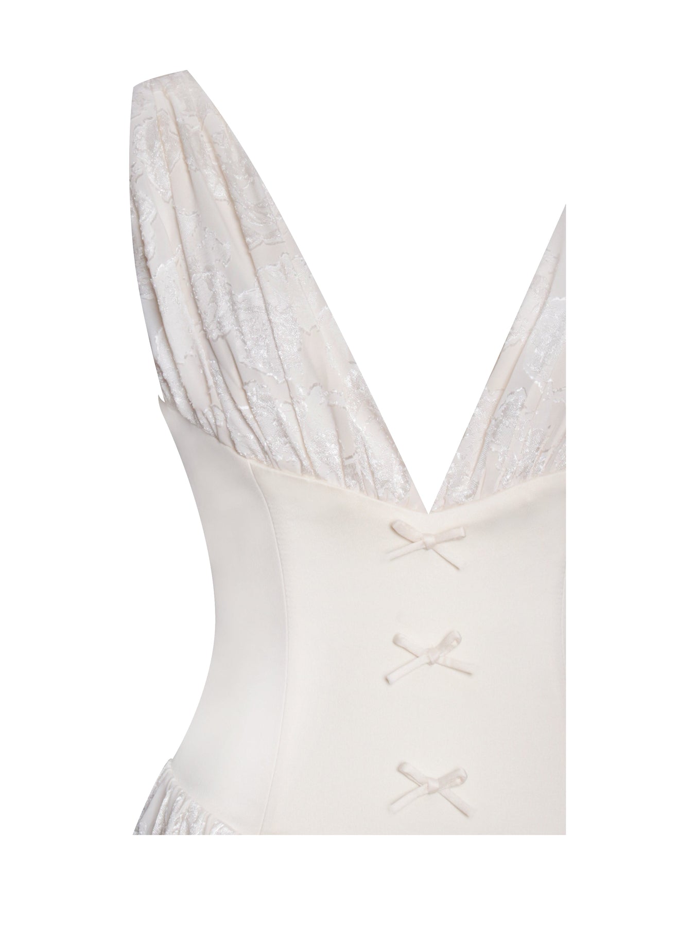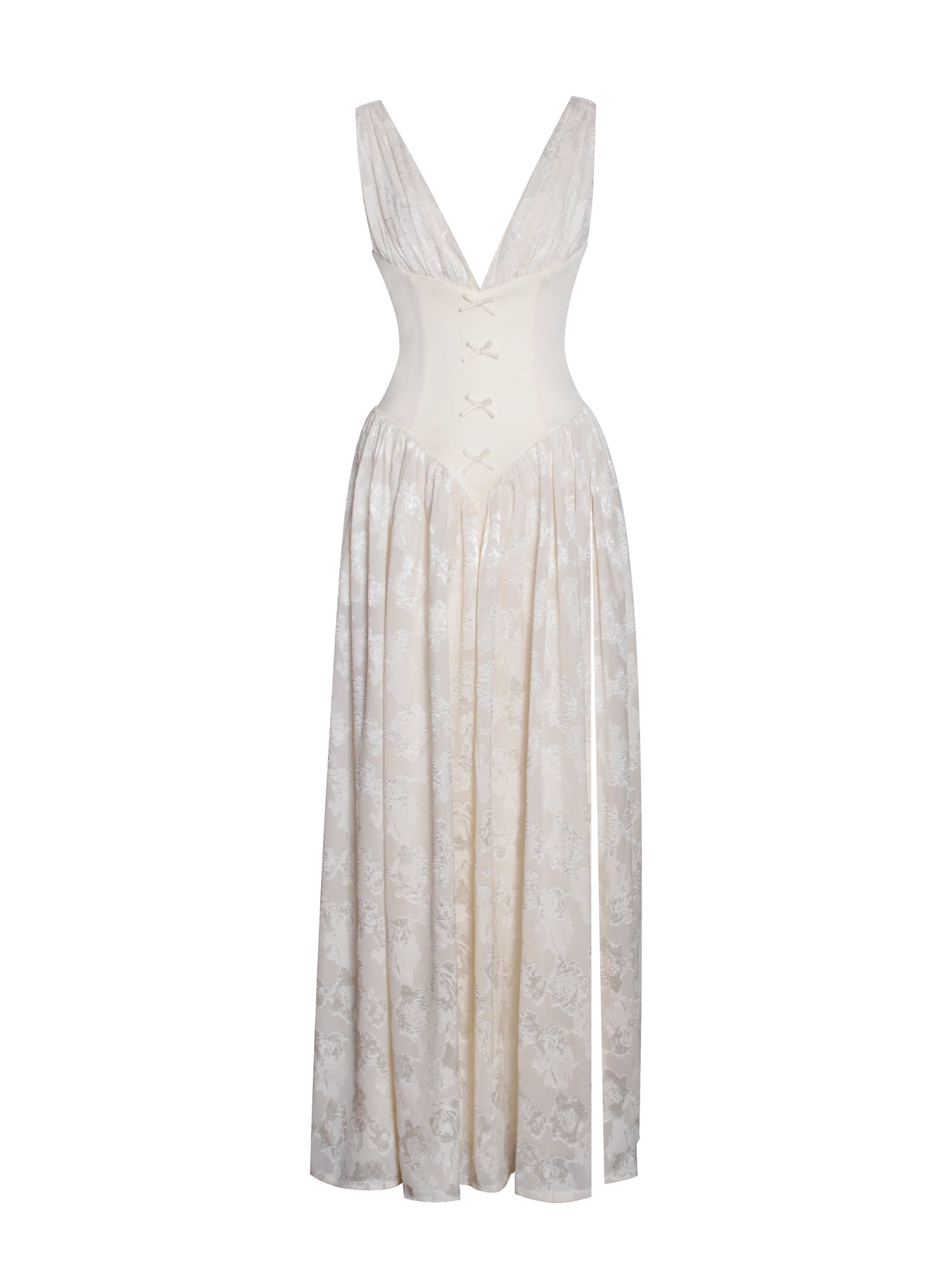 Elevate your style with the captivating elegance of the Sabrina Dress. Crafted from luxurious jacquard fabric in a soft butter yellow hue, this dress exudes timeless charm. The deep V collar and V-shape waistline create a flattering silhouette, while the lace-up back adds a touch of intrigue and adjustability. A high slit enhances the allure, allowing effortless movement and showcasing your legs with grace. Delicate bowtie decorations complete the look with a feminine finish. Perfectly balanced between sophistication and playfulness, the Sabrina Dress is ideal for any special occasion.