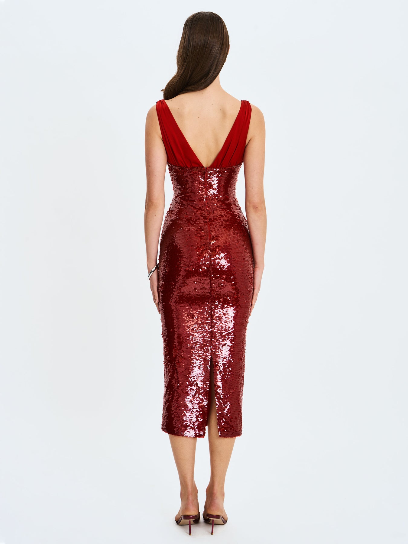 Turn heads without even trying in the Shanelle Dress, a crimson red number that nails effortless holiday glam. The plunging neckline meets a ruched satin bust that catches the light just right, while the sequin mesh bodice adds that perfect dose of sparkle. Fully lined in satin with a sleek midi length and back vent for easy movement, it’s made for dancing, dining, and every impromptu toast of the season. Equal parts flirty and festive, this is your go-to when the invite says “holiday chic”.