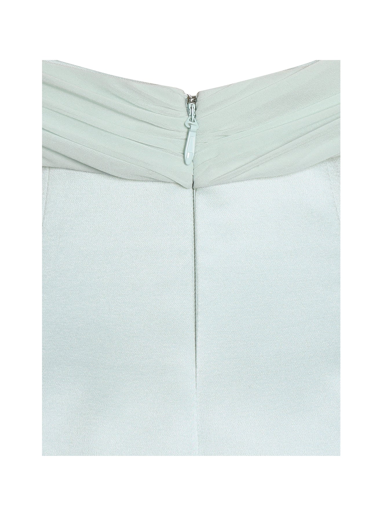 The Zafrina Dress is a business casual statement piece perfect for the office and spring gatherings. Designed in a flattering A-line silhouette, it features delicate chiffon trim that adds an ethereal touch. The off-shoulder design with ruched chiffon detailing exudes elegance, while the backless feature creates a subtle yet striking look. Thoughtfully crafted with invisible pockets and an invisible zipper, this dress is fully lined for comfort. The light cyan hue enhances its fresh and sophisticated appeal, making it ideal for both professional and chic occasions.