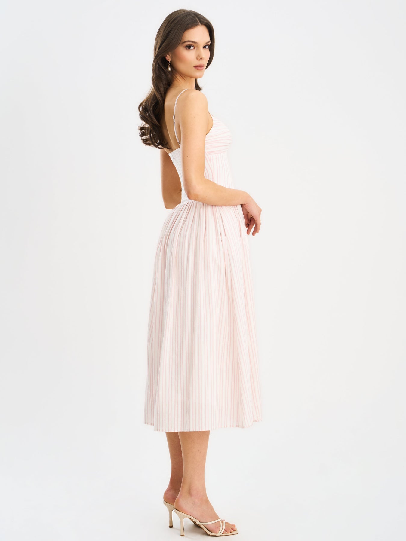 Charming and effortlessly flattering, the Zania Dress features a ruched breast and a soft pink and white stripe pattern enhanced by delicate woven detailing. The drop waist and V-shaped waistline sculpt the figure beautifully, supported by built-in bones for added structure. Designed with adjustable straps, practical pockets, and an invisible zipper, this midi-length dress is fully lined for comfort and elegance. A timeless piece perfect for warm days, garden parties, or casual chic occasions.